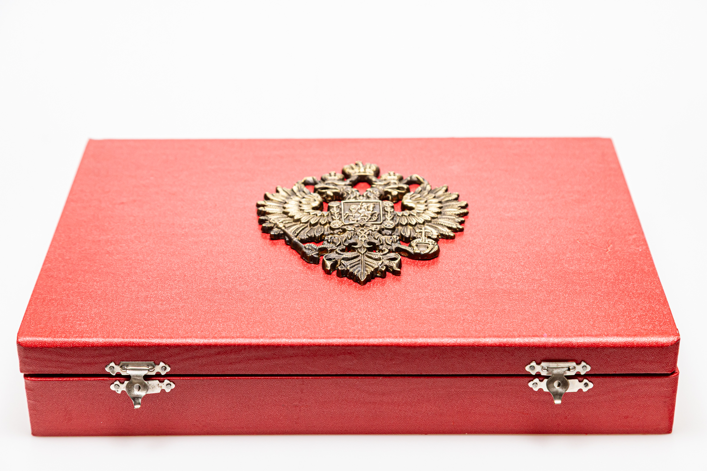 Pudełko na sztućce ozdobione rosyjskim orłem.